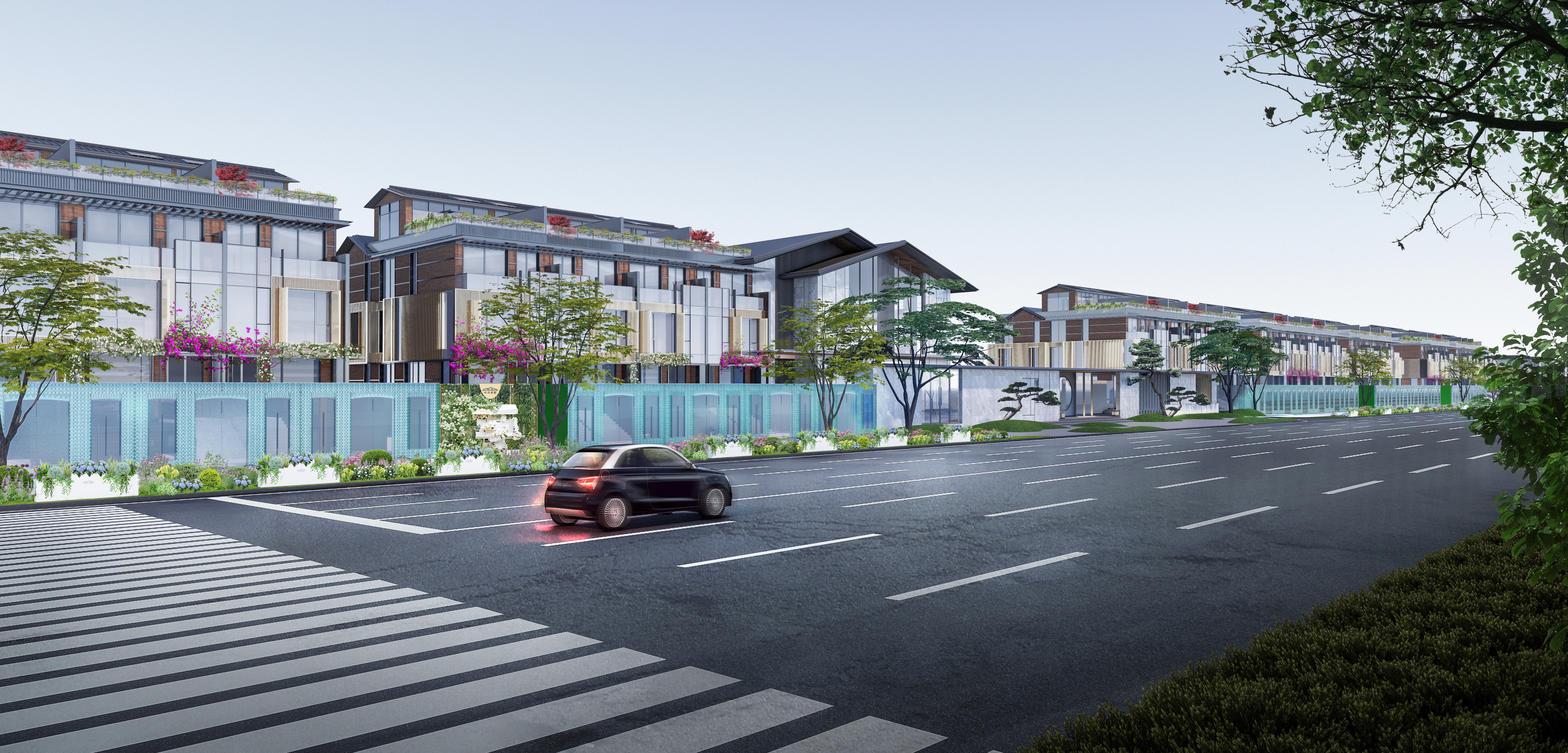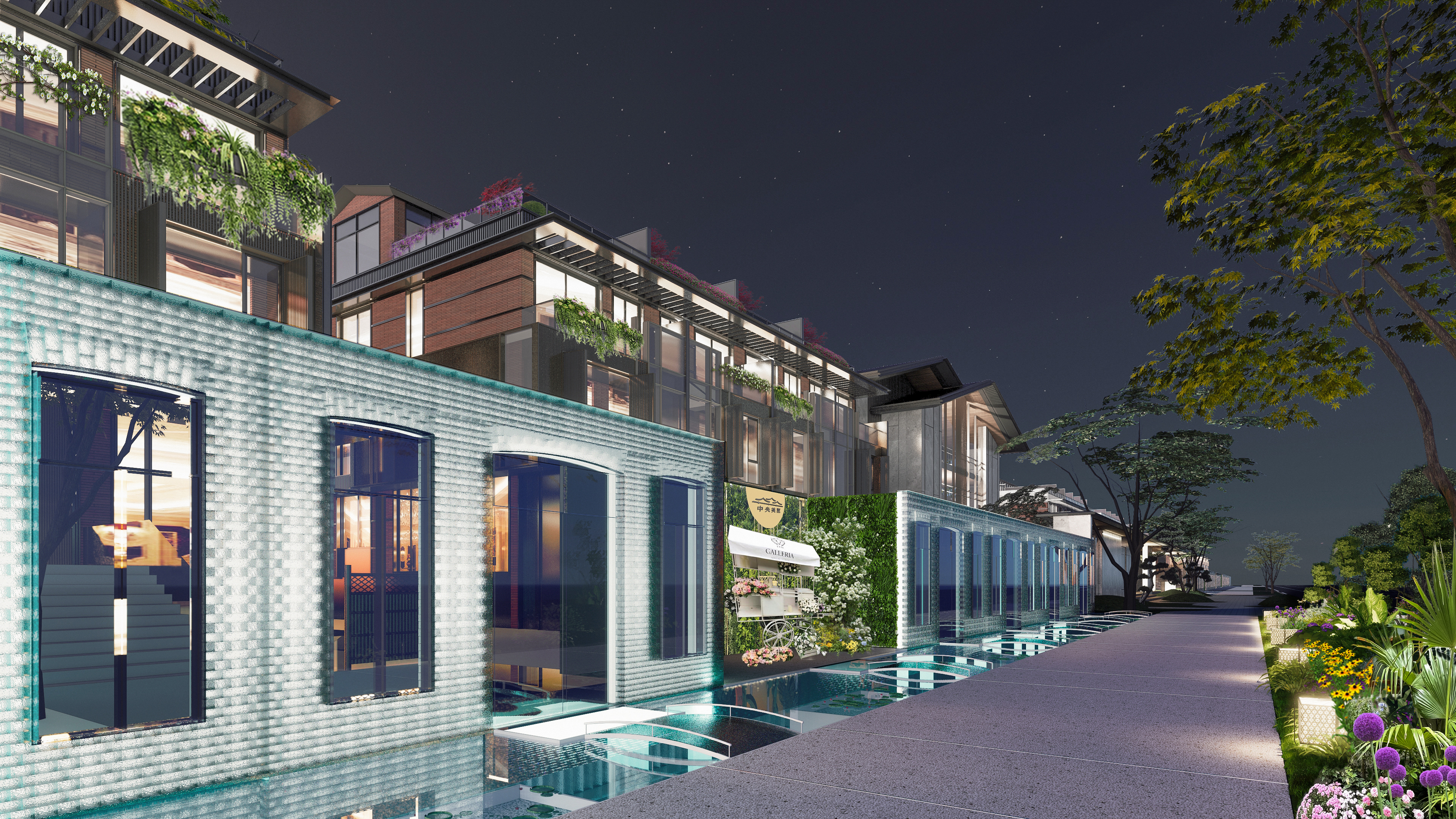 中央美墅沿街的水晶琉璃院墙花街已申报世界吉尼斯纪录,总长度400余米,高度3.2米。人行路面全面升级为水洗石路面,每一步都感受着大自然的温柔。花境采用时令鲜花,四季长青。当夜幕降临,花街的夜景灯光如星辰般璀璨,照亮了回家的路。