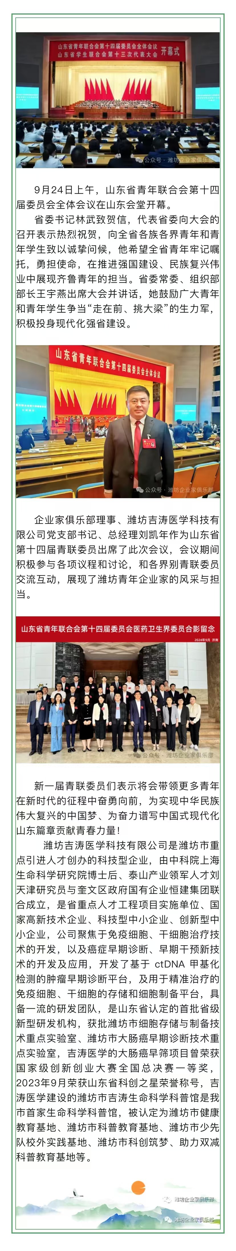 祝贺潍坊东方企业家俱乐部理事、吉涛医学总经理刘凯年当选山东省青联委员