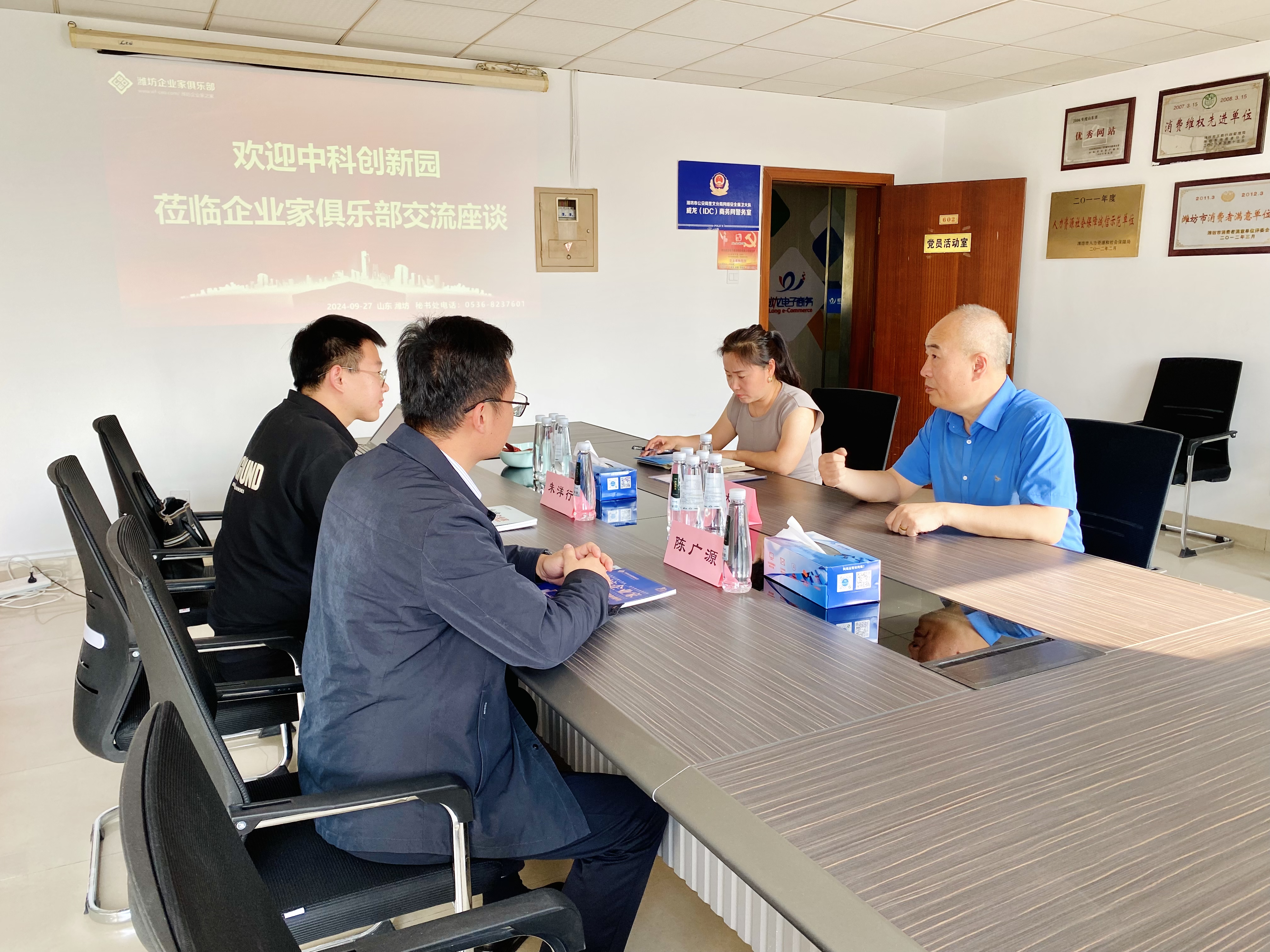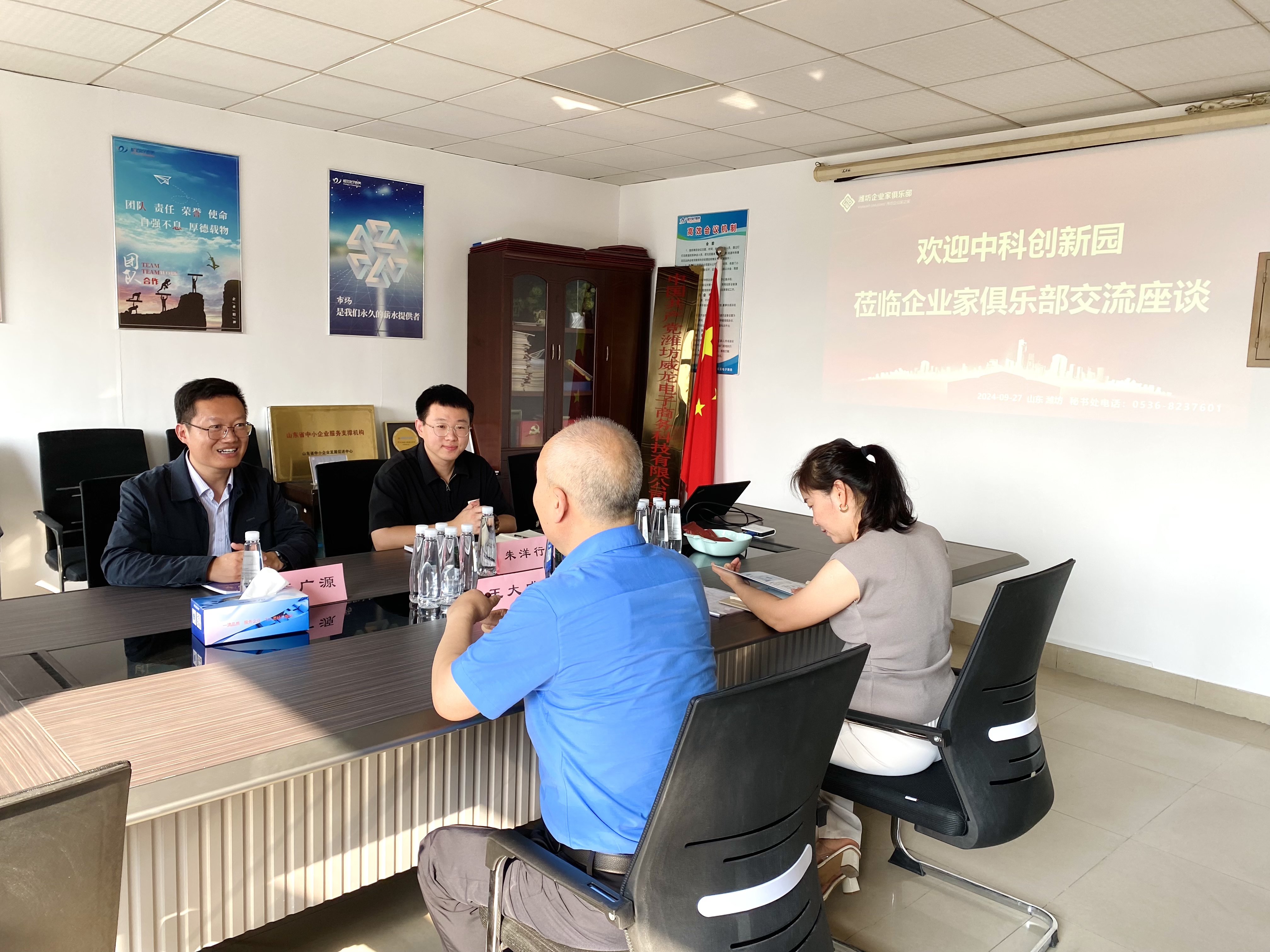 9月27日,中科创新园总经理助理陈广源,服务经理朱洋行一行至潍坊东方企业家俱乐部进行座谈交流。潍坊东方企业家俱乐部理事长王大威,副秘书长、潍坊威龙电子商务科技有限公司总经理王翠萍做热情接待。