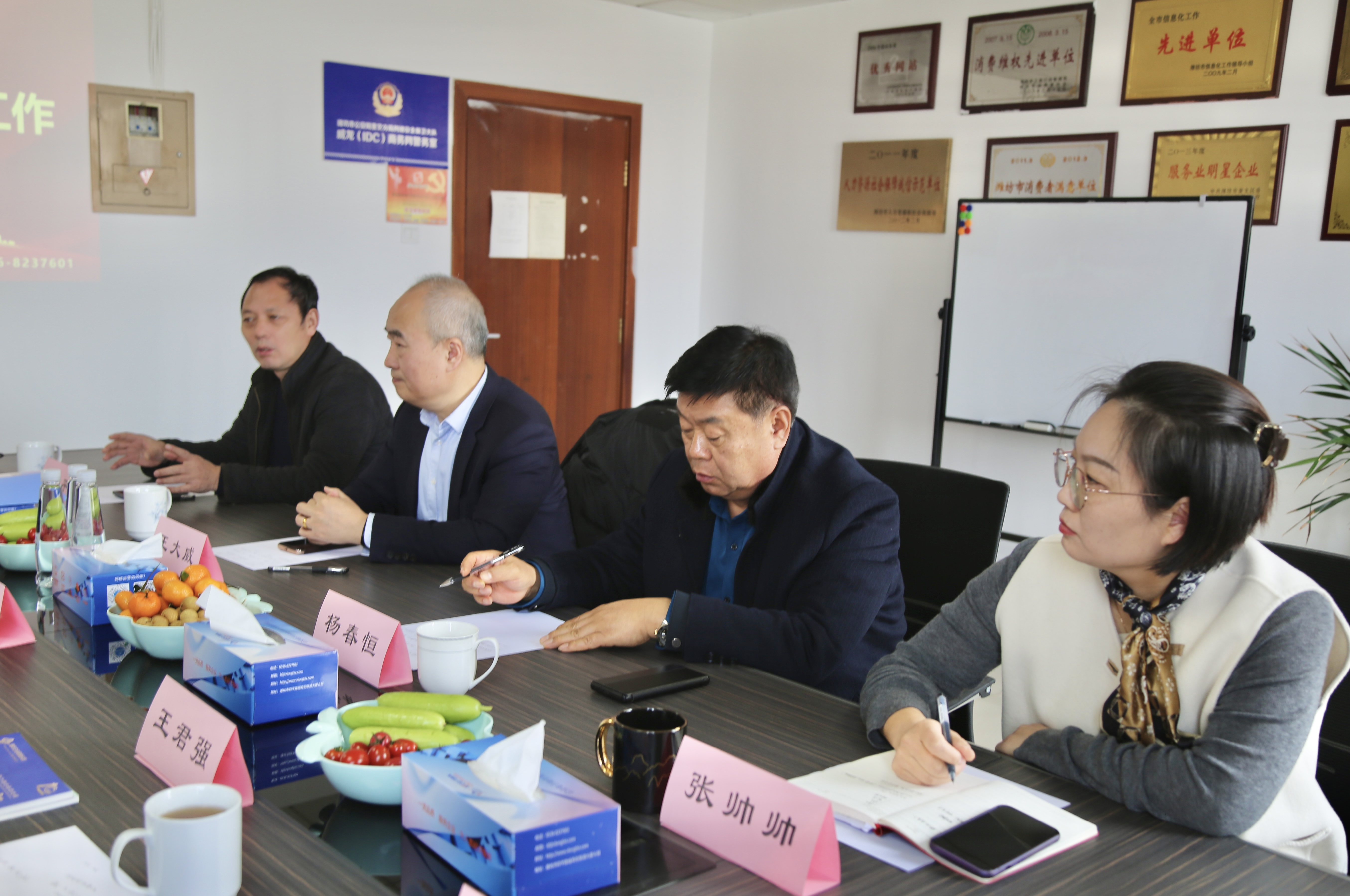 潍坊东方企业家俱乐部理事长王大威,常务理事长、山东衡明律师事务所主任杨春恒,副理事长、潍坊奎文口腔医院院长章和平、山东鑫达鲁鑫防水材料有限公司总经理孙美峰,执行秘书长张帅帅作热情接待。