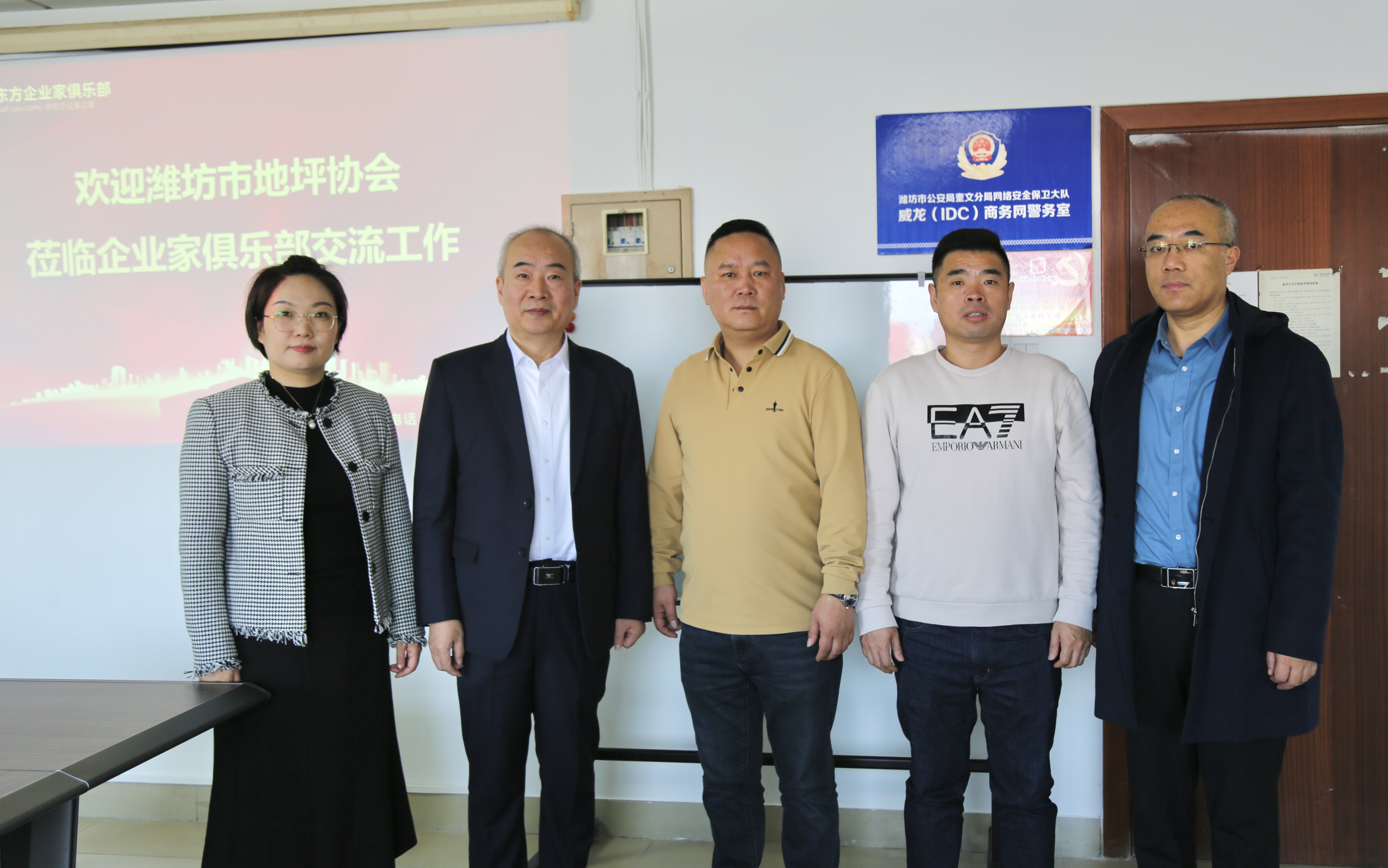 为进一步加强行业交流、探索合作机遇,2月14日,潍坊市地坪协会会长石宜长,轮值会长张行,执行秘书长郭小鹏一行到访潍坊东方企业家俱乐部。