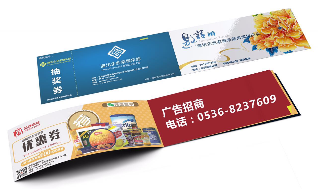潍坊东方企业家俱乐部两周年庆典将于2016年7月在潍坊北辰湿地公园 和润·尚公馆 项目基地举办,现场500余名成功企业家及社会名流参与。为给各优秀企业提供一个展示形象,推广产品的平台,本届展会参观门票上的部分广告页现对外招商。本次庆典活动门票发行量巨大,覆盖面广,具有很强的宣传力度。版面有限,欲购从速!