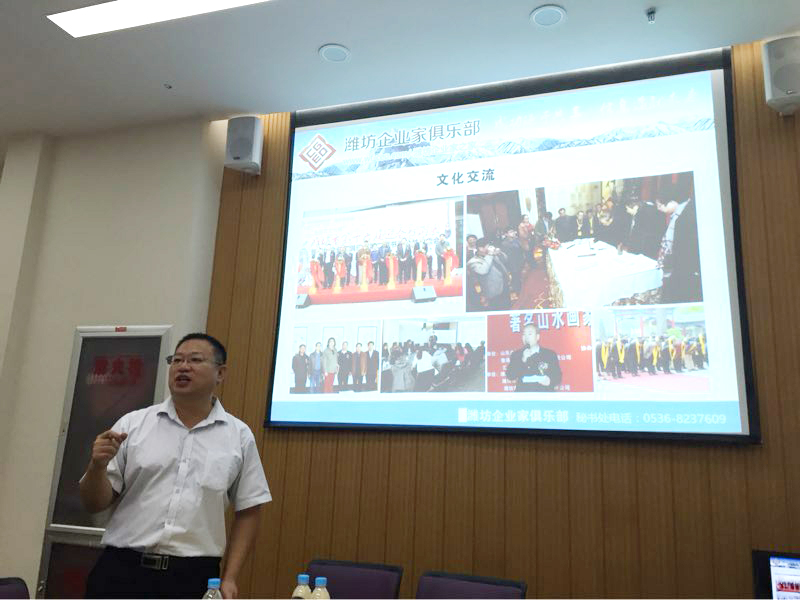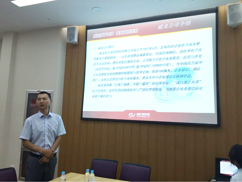 潍坊东方企业家俱乐部副秘书长、潍坊威龙电子商务有限公司总经理助理赵耀向各位企业家介绍了潍坊威龙电子商务有限公司的发展情况和主营业务。