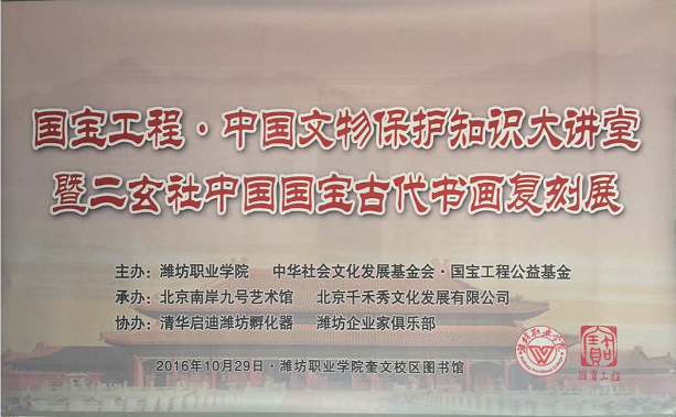 10月29日,由山东潍坊职业学院、中华社会文化发展基金会·国宝工程公益基金共同主办,潍坊东方企业家俱乐部协办的“国宝工程·中国文物保护知识大讲堂暨二玄社中国国宝古代书画复刻展”在潍坊职业学院成功举行。潍坊东方企业家俱乐部会长王大威,高级顾问张国华,副会长谢棣华、杨春恒,副秘书长陈建立、赵化民、佟向辉等潍坊东方企业家俱乐部部分领导亲临现场参观了本次展览。