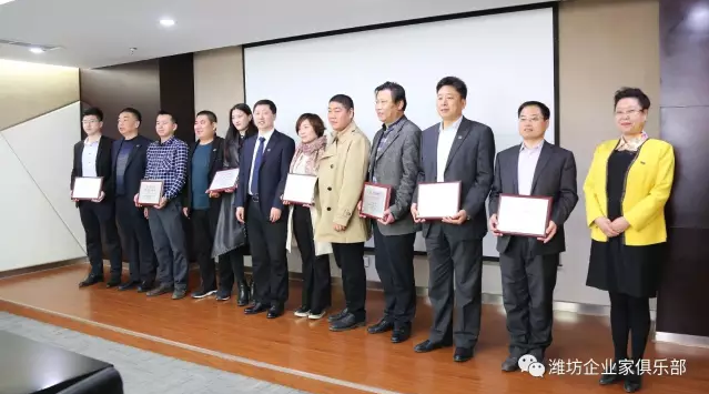 会上还为一届九次理事会批准通过的潍坊东方企业家俱乐部领导成员举行了集体授牌仪式。会长王大威为各常务会长颁发会牌,各常务会长为一届九次理事会上通过的12名理事领导颁发会牌。