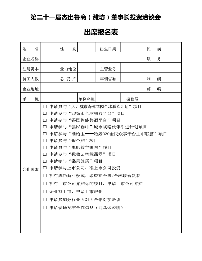 参会人员:潍坊市包含县市区有项目对接需求的企业董事长、总经理和外地部分企业家(企业注册资金100万以上)